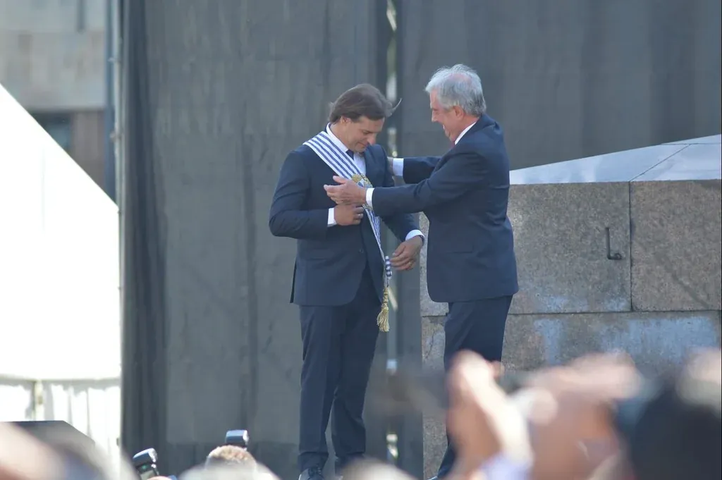 16.24 Sonriente, Tabaré Vázquez se quitó la banda presidencial y se la colocó a Lacalle, nuevo presidente de la República. Del brazo se caminan hacia un lado del escenario para la salida de Vázquez.