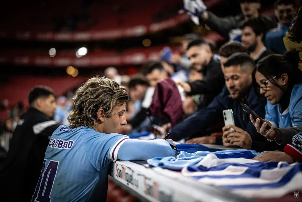 Otros jugadores hicieron lo mismo. Manuel Ugarte se acercó y firmó camisetas y banderas, al igual que Agustín Canobbio.