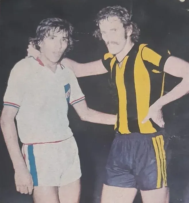 Pablo Forlán cuando retornó a Peñarol y luego de un clásico ante Nacional en 1976 posando con Juan Carlos Ocampo, a quien debió marcar en ese partido; en 1983 serían compañeros en Defensor