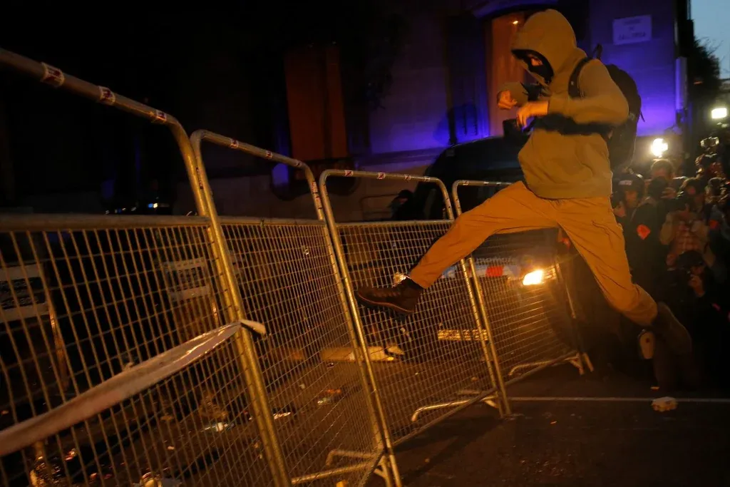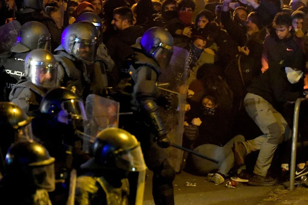 La protesta en Barcelona reunió a unas 40.000 personas, y durante dos horas, las fuerzas policiales que protegían la delegación -policía catalana, Mossos d'Esquadra, en primera fila, y policía nacional en segunda fila- aguantaron ante los lanzamientos de petardos, botellas y objetos de los manifestantes, algunos de ellos con las caras cubiertas.