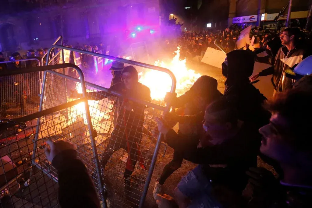 La potente respuesta policial, a base de porras y disparos de fogueo, arrastró la columna de manifestantes hacia el Paseo de Gracia, donde la noche derivó en un aquelarre de fogatas a base de cartones, barricadas ardiendo, corridas y cargas policiales según se movían los manifestantes más radicales. La policía anunció que hubo tres detenidos en Barcelona.
