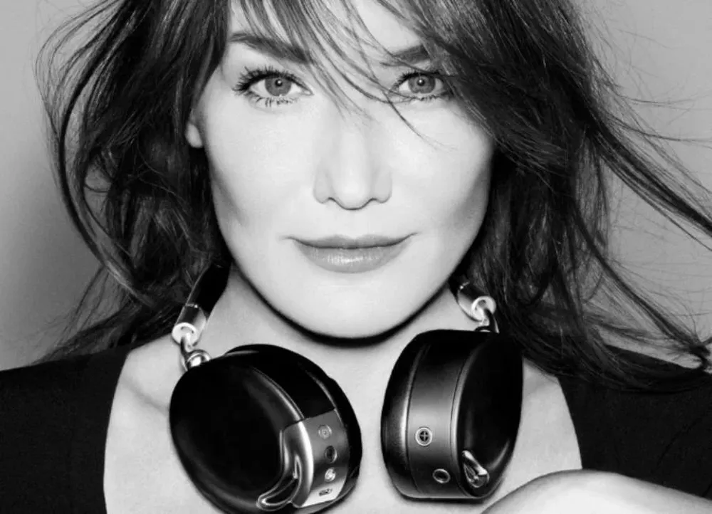 En una imagen tomada por el fotógrafo Jean-Baptiste Mondino, Bruni aparece de frente y en blanco y negro con los cascos alrededor del cuello, unos Zik modelo Bluetooth, ideados por el prestigioso diseñador francés Philippe Starck.