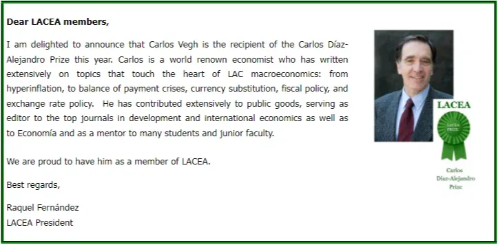 Carlos Végh fue seleccionado para recibir el premio Carlos Díaz-Alejandro que entrega la Latin American and Caribbean Economic Association (Lacea). Se trata del primer uruguayo en obtener la distinción, adjudicada por primera vez en 1998.