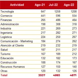En segundo y tercer lugar se ubicaron comercio y finanzas, con el 11% y el 10% del total. También hubo llamado para administración, industria e ingeniería. El turismo fue el área que tuvo mayor incremento con respecto a julio, con un aumento de 12%. Luego se ubicaron logística y administración, con subas de 7% y 3%, respectivamente.