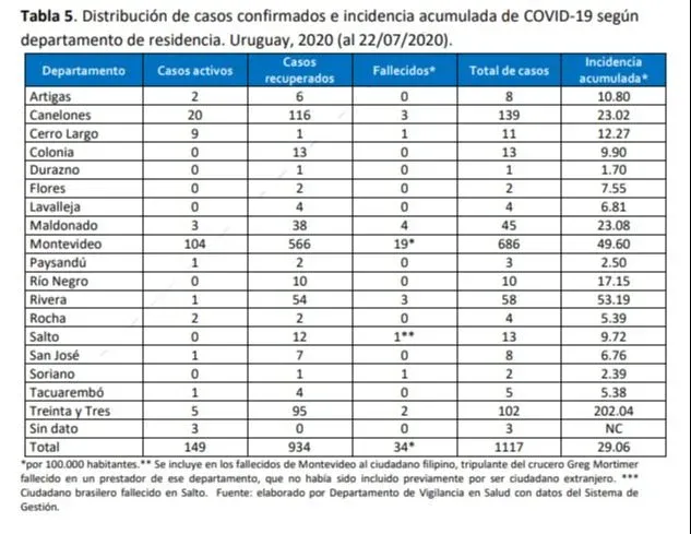 El departamento con más fallecidos fue Montevideo (19 muertos, incluyendo al ciudadano filipino que viajaba en el Greg Mortimer) seguido por Maldonado con cuatro personas que perdieron la vida a causa del covid-19.