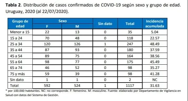 El Ministerio de Salud Pública hizo público este jueves su último informe epidemiológico, con fecha al 22 de julio, que revela datos tales como el sexo, la edad y la ubicación geográfica de todos los casos de coronavirus que hubo en Uruguay así como si tuvieron síntomas o no, o si requirieron ser internados. Según el informe, del total de infectados, fueron más las mujeres (592) que los hombres (524). Y la franja etaria con más casos registrados fue la de 25 a 34 años con 247 pacientes de covid-19.
