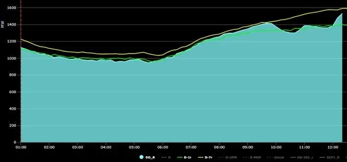 En celeste la demanda de este jueves, en amarillo la del jueves 17 (temperatura similar) y en verde la demanda de ayer (con temperatura distinta)