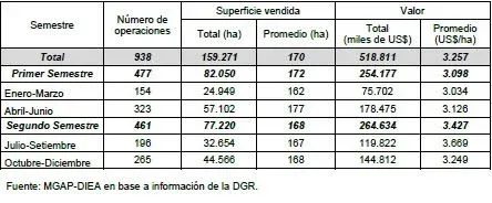 Durante el año analizado, el número de operaciones se distribuyó de modo equilibrado entre el primer y segundo semestre, en tanto que el valor por hectárea resultó un 10% mayor al cabo del segundo.