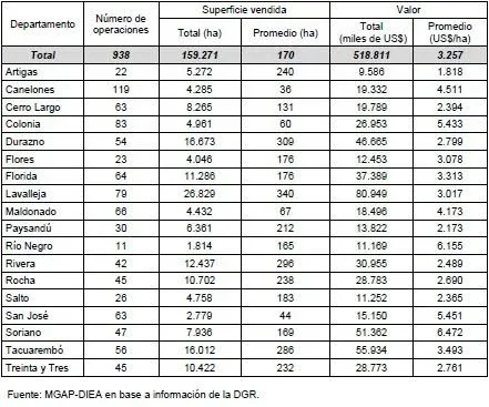 En el trabajo denominado serie Precio de la tierra, la DIEA establece que los departamentos con mayor superficie operada fueron Lavalleja, Durazno y Tacuarembó, acumulando casi 60 mil hectáreas y US$ 184 millones, lo que constituye el 37% y el 35%, respectivamente, de los totales respectivos del año.