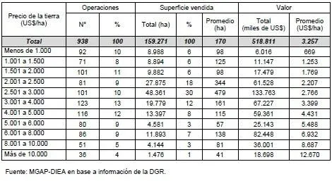 Según se informó a El Observador, técnicos de dicha oficina analizaron el precio de las compras y ventas de tierras para uso agropecuario ocurridas de enero a diciembre del año pasado, lapso en el que se realizaron 938 operaciones que comprendieron una superficie de 159 mil hectáreas. Las cifras del último ejercicio anual completo representan un 18% y un 15% menos, respectivamente, que el año anterior.
