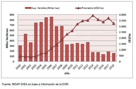 El valor medio para el período es de US$ 1.607/ha, con extremos que oscilan entre US$ 386/ha para el año 2002 y US$ 3.934/ha para el año 2014. El precio medio anual de la hectárea aumentó ininterrumpidamente entre el año 2003 hasta el 2014, disminuyendo desde entonces hasta el presente.