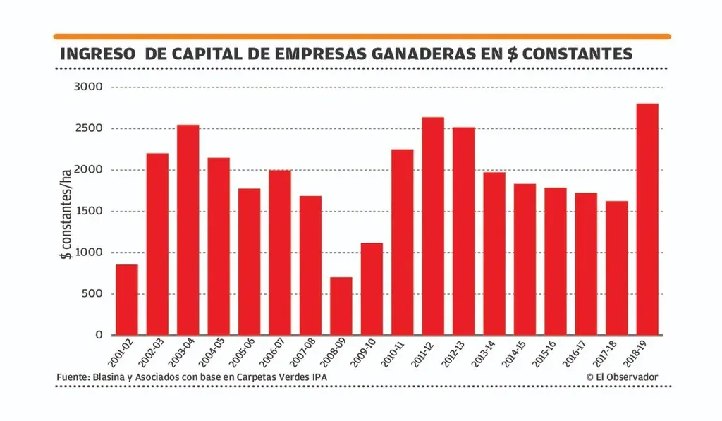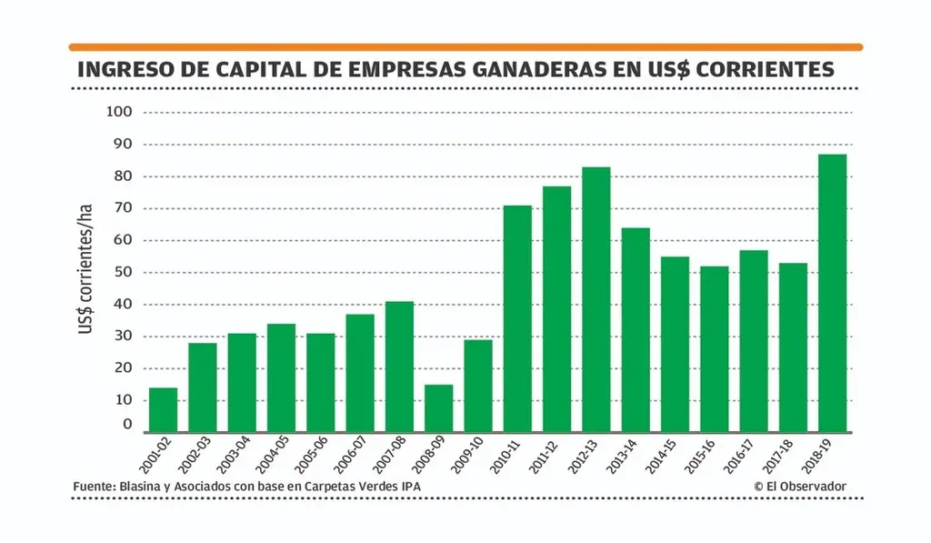 La cifra: 87 US$/ha fue el ingreso promedio de las empresas ganaderas durante el ejercicio 2018/19 antes de pagar renta e intereses. Ese valor es significativamente superior a los últimos cuatro resultados obtenidos.