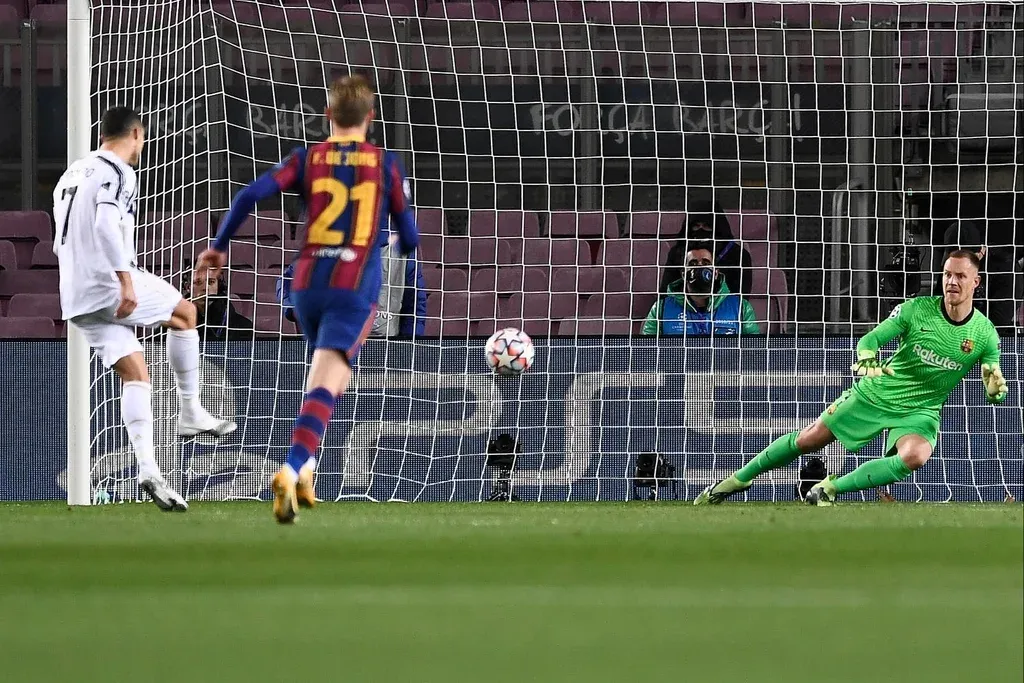 En una noche de pesadilla para los azulgranas, que llegaban con cinco victorias, Juventus le arrebató la primera plaza, que le ofrece un mejor sorteo de octavos, gracias a los tantos de penal de Ronaldo (13' y 52') y un tijeretazo del estadounidense Weston McKennie (20') tras exquisita asistencia de Juan Guillermo Cuadrado.