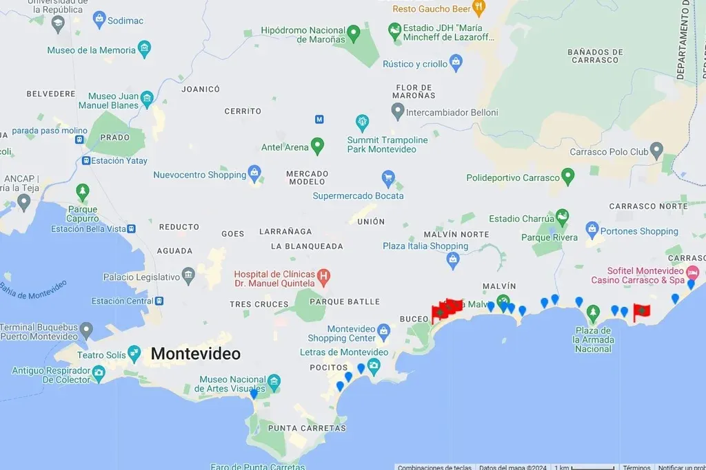 Según el mapa, hay dos playas del país en las que la bandera sanitaria persiste. Son las dos en Montevideo que aunque la Intendencia luego haya dicho que las cianobacterias se eliminaron, continúa la bandera sanitaria.