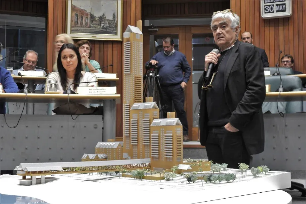 Rafael Viñoly con la maqueta del proyecto inicial que se modificó semanas más tarde
