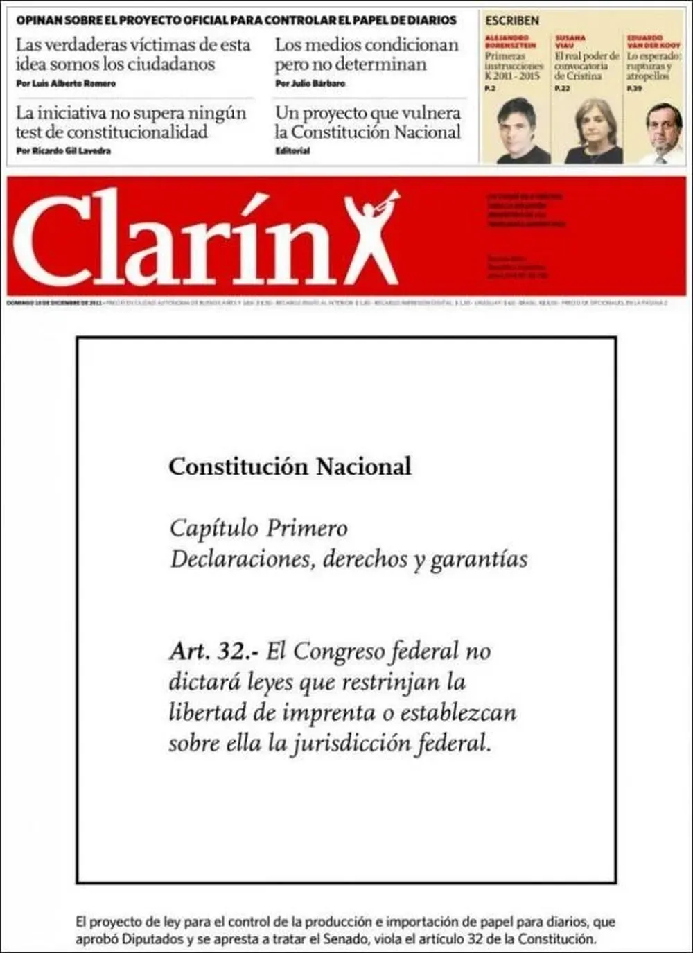 El diario argentino Clarín sorprendió este domingo con una tapa blanca en la que, al acercarse, se puede ver una cita de la Constitución argentina: “El Congreso federal no dictará leyes que restrinjan la libertad de imprenta o establezcan sobre ella la jurisdicción federal”, dice el texto correspondiente al artículo 32 de Capítulo Primero, Declaraciones, derechos y garantías.
