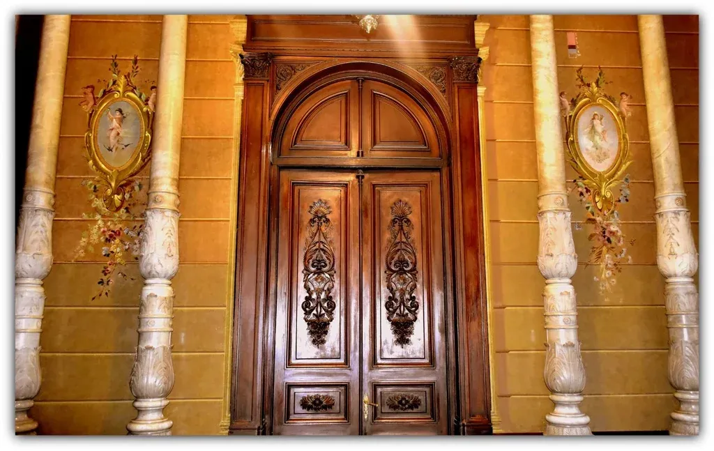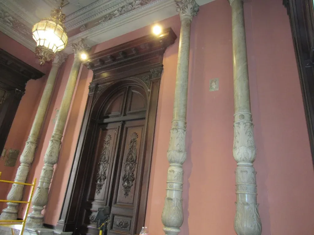 Frigerio se encontraba trabajando en 2016 en el proceso de restauración de la puerta principal del Palacio Santos que, tras haber sido incendiada durante la dictadura, se encontraba carbonizada. Después de recuperar la puerta, el pedido al equipo de la restauradora fue que pintaran la pared que también tenía depositada carbón. "La restauración que me marcó fue la del Palacio Santos, descubrir ese mural y sacarlo de debajo de cinco capas de pintura, encontrar aquello fue mágico, de los mejores trabajos… No sabíamos con qué nos íbamos a encontrar", cuenta. Frigerio realizó una escala estratigráfica (se abre el muro en la pintura y luego se baja capa por capa). "La textura de la primera capa me habló de que podía haber algo más entonces, abrimos escalas estratigráficas corridas –que es abrir todo un muro a lo largo y ancho de una tira– y ahí vimos que había pintura y empezamos a abrir "ventanas". De repente nos apareció el ojo del pájaro, seguimos abriendo y apareció la alegoría a la virgen",dice. Así fue como se encontraron con Alegorías, la pintura mural del suizo Martino Perlasca. La obra es de aproximadamente 1883 y está ubicada en el zaguán del edificio.