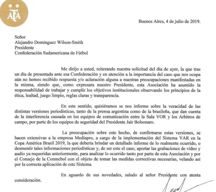 Al día siguiente de la derrota 2-0 de Argentina con Brasil en semifinales, el presidente de la AFA envió una nota de queja a la Conmebol denunciando que lo ocurrido en el partido "pone en duda que se hayan observado los principios de ética, lealtad y transparencia" y citó "graves y groseros errores arbitrales".