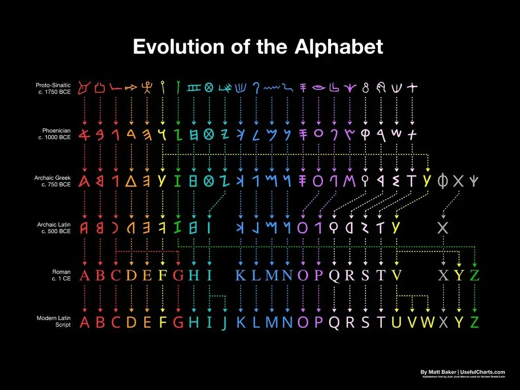 Alfabeto. Así de contradictorios somos los seres humanos, o al menos este ser humano que hoy te escribe: anhelo una pausa en redes sociales y al mismo tiempo le agradezco a internet que me acerque conocimientos que, de otra manera, casi seguro jamás llegarían a mí. ¿Cómo evolucionó el alfabeto del griego al latín y desde antes? Este gráfico te lo muestra. Solo una pista: todo indica que la A deriva del dibujo de una vaca o bisonte o algo parecido.
