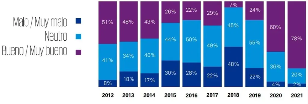 El 78% de las empresas encuestadas percibe que el clima de negocios es “bueno” o “muy bueno”, siendo este el máximo porcentaje registrado desde que comenzó a formularse la misma pregunta en la edición del año 2012.