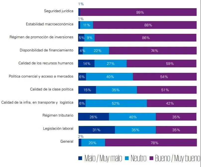 También se preguntó a las empresas sobre la percepción del clima de negocios según diez categorías específicas. En ese sentido, sobresalió la percepción positiva en la seguridad jurídica, la estabilidad macroeconómica y el régimen de promoción de inversiones. Pero por primera vez desde 2012, el saldo neto fue positivo (es decir, mayor número de empresarios con percepción buena que con percepción mala) en todas las categorías consultadas, incluyendo a la legislación laboral que típicamente era una categoría con percepción negativa según la mayoría de los empresarios.