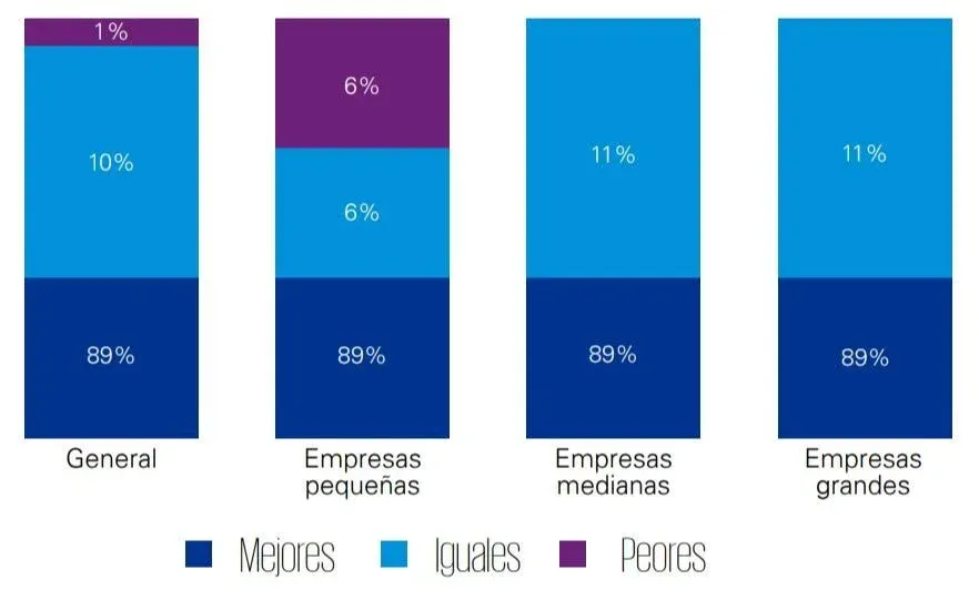 En empresas grandes la continuidad del régimen híbrido asciende a 67%, mientras que el 28% volverá a la presencialidad plena y el 5% nunca aplicó teletrabajo. Como contrapartida, en empresas medianas el 41% prevé mantener el régimen de trabajo híbrido, contra el 44% que volverá a la presencialidad plena y 15% que nunca aplicó trabajo remoto.