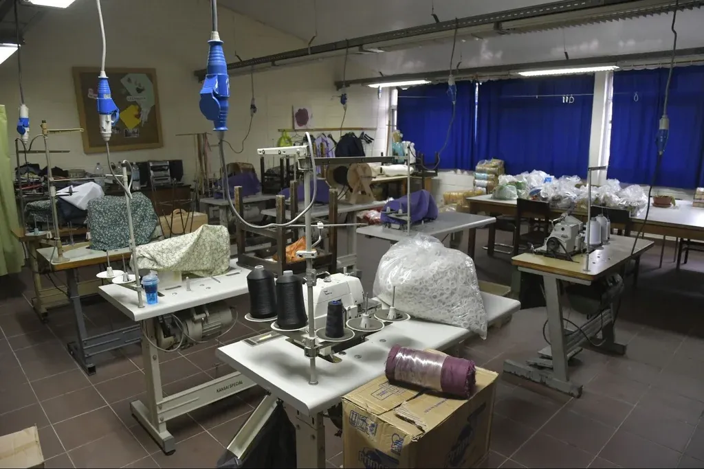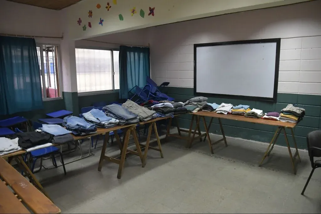 “Este es el taller de vestimenta transformado en depósito”, dice el director, Daniel Bernardoni, al tiempo que muestra las instalaciones. En otro salón, prendas de ropa obtenidas a través de donaciones se encuentran apiladas sobre las mesas. Todo sirve para apoyar a las familias.