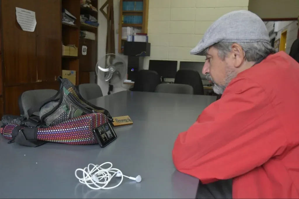 En la sala de docentes de la Escuela de Oficios un educador se encuentra en plena reunión por Zoom. El resto del equipo acompaña desde la casa.