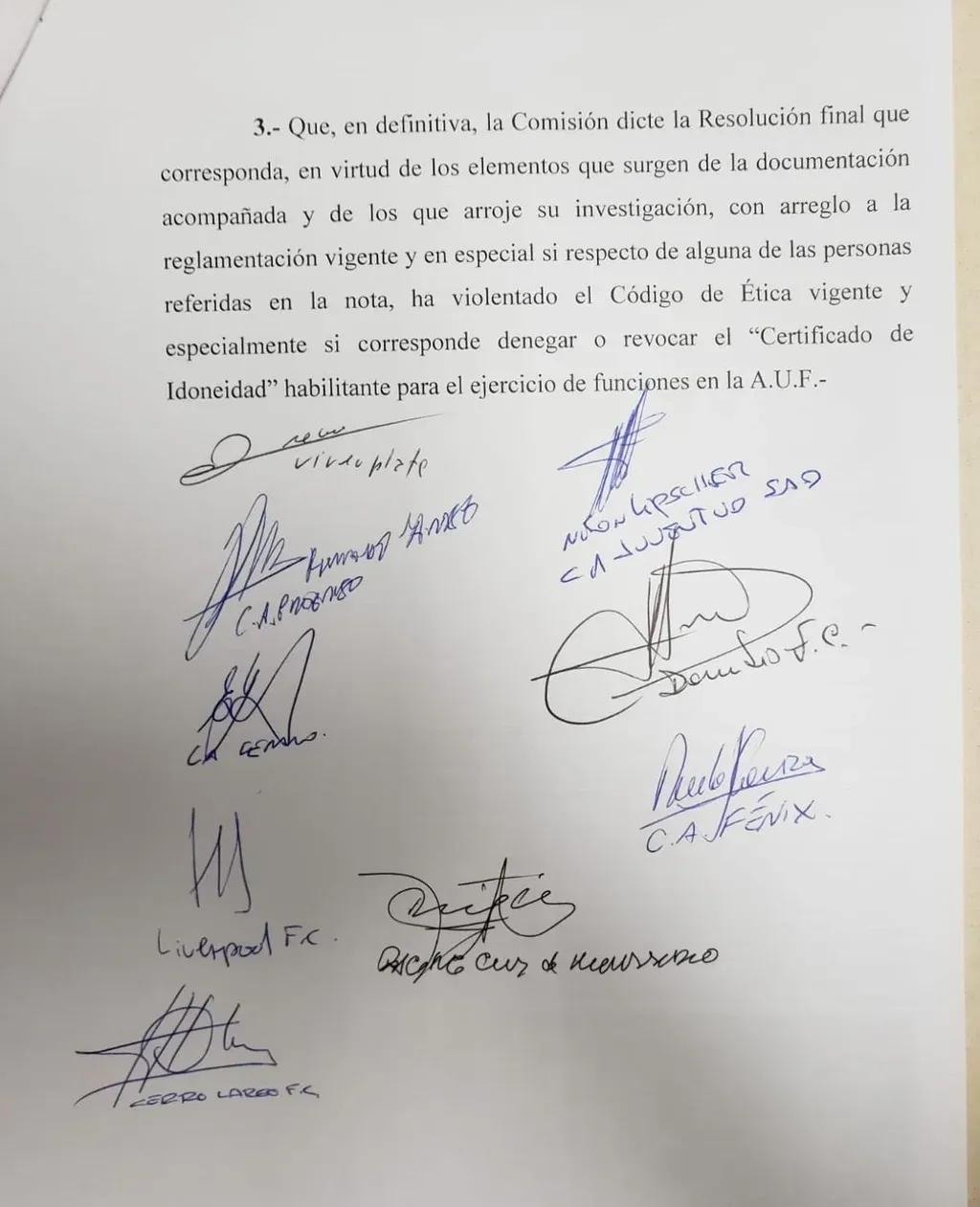 A continuación la carta que los clubes enviaron a la AUF y a la Comisión de Honor de la Conmebol.