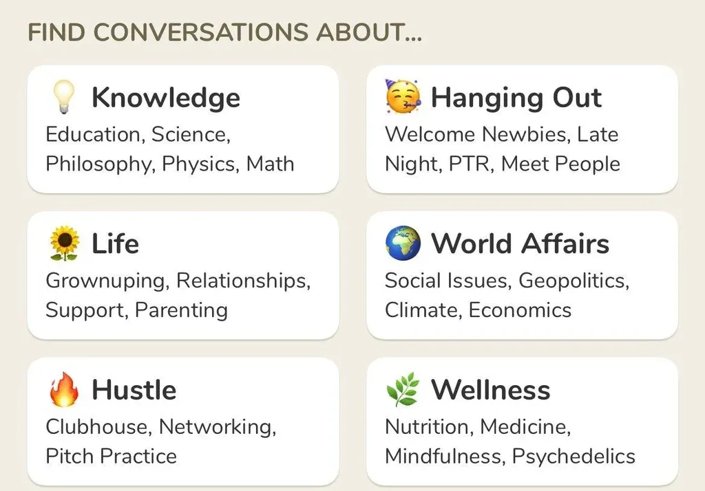 Captura de Pantalla Clubhouse “Clubhouse es solo de voz y creemos que la voz es un medio muy especial. Sin la cámara encendida, no tiene que preocuparse por el contacto visual, lo que está usando o dónde se encuentra. Puede hablar en Clubhouse mientras dobla la ropa, amamanta, viaja, trabaja en su sillón, en el sótano o cuando sale a correr. En lugar de escribir algo y apretar ‘Enviar’, estás involucrado en un diálogo de ida y vuelta con los demás. La entonación, la inflexión y la emoción que se transmite a través de la voz le permiten captar los matices y formar conexiones exclusivamente humanas con los demás. Todavía puedes tener conversaciones difíciles, pero con la voz a menudo existe la capacidad de generar más empatía. Esto es lo que nos atrajo al medio”, explicaron sus dueños.