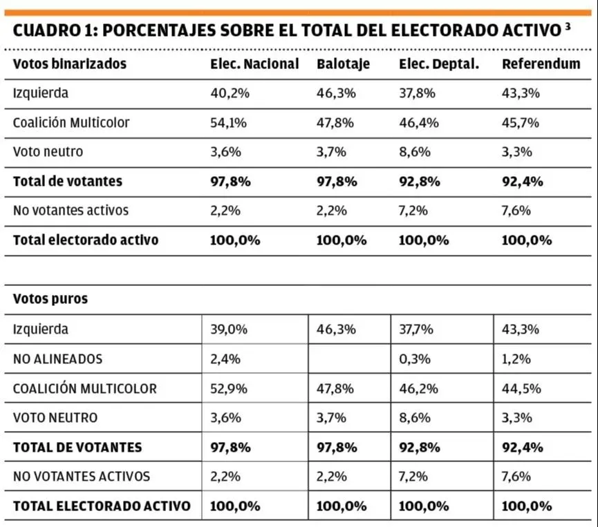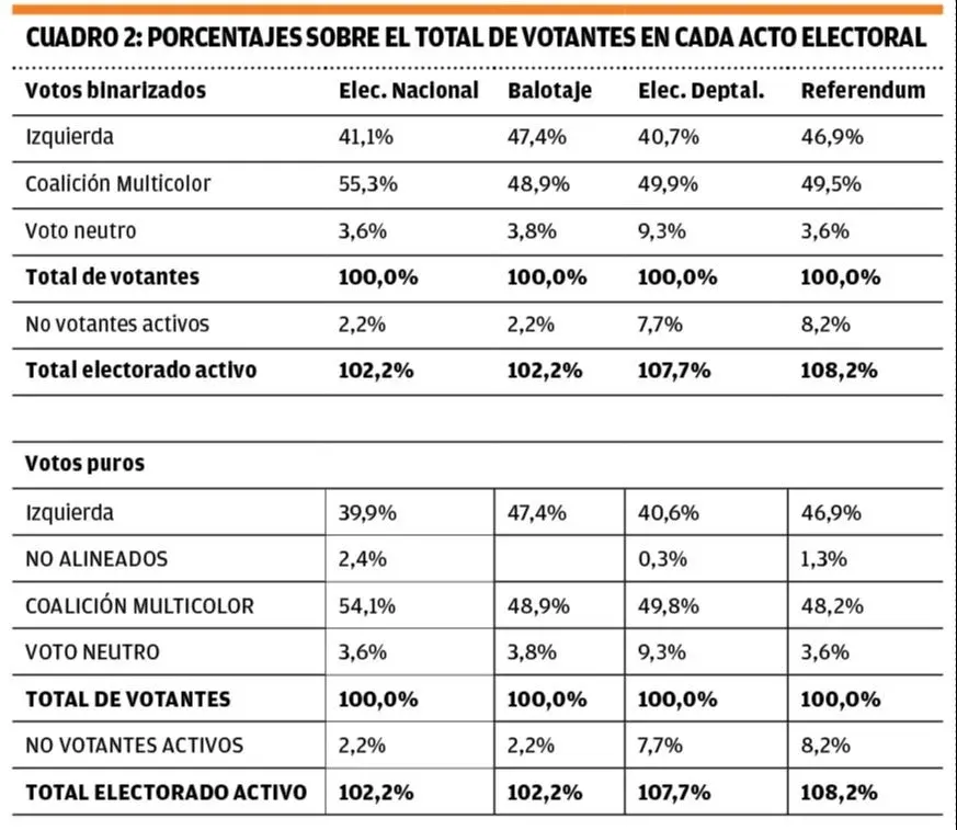 Uno. La Coalición Multicolor tuvo un pico en las Elecciones Nacionales de octubre de 2019. Luego cae y se mantiene estable en el orden del 49-50% sobre el total de votantes, con independencia de la arquitectura electoral, si es múltiple o binaria.