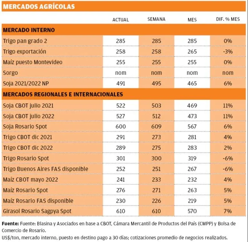 El maíz acompaña a la soja y el trigo. Las pérdidas productivas para el maíz en Argentina están limitadas a los maíces de primera y se precisa esperar para ver cómo compensan los maíces tardíos y de segunda. Se espera una merma del potencial, lo mismo que en Uruguay. Los precios de maíz seco están firmes en US$ 290 y los maíces partidos a unos US$ 260, con un ligero aumento.