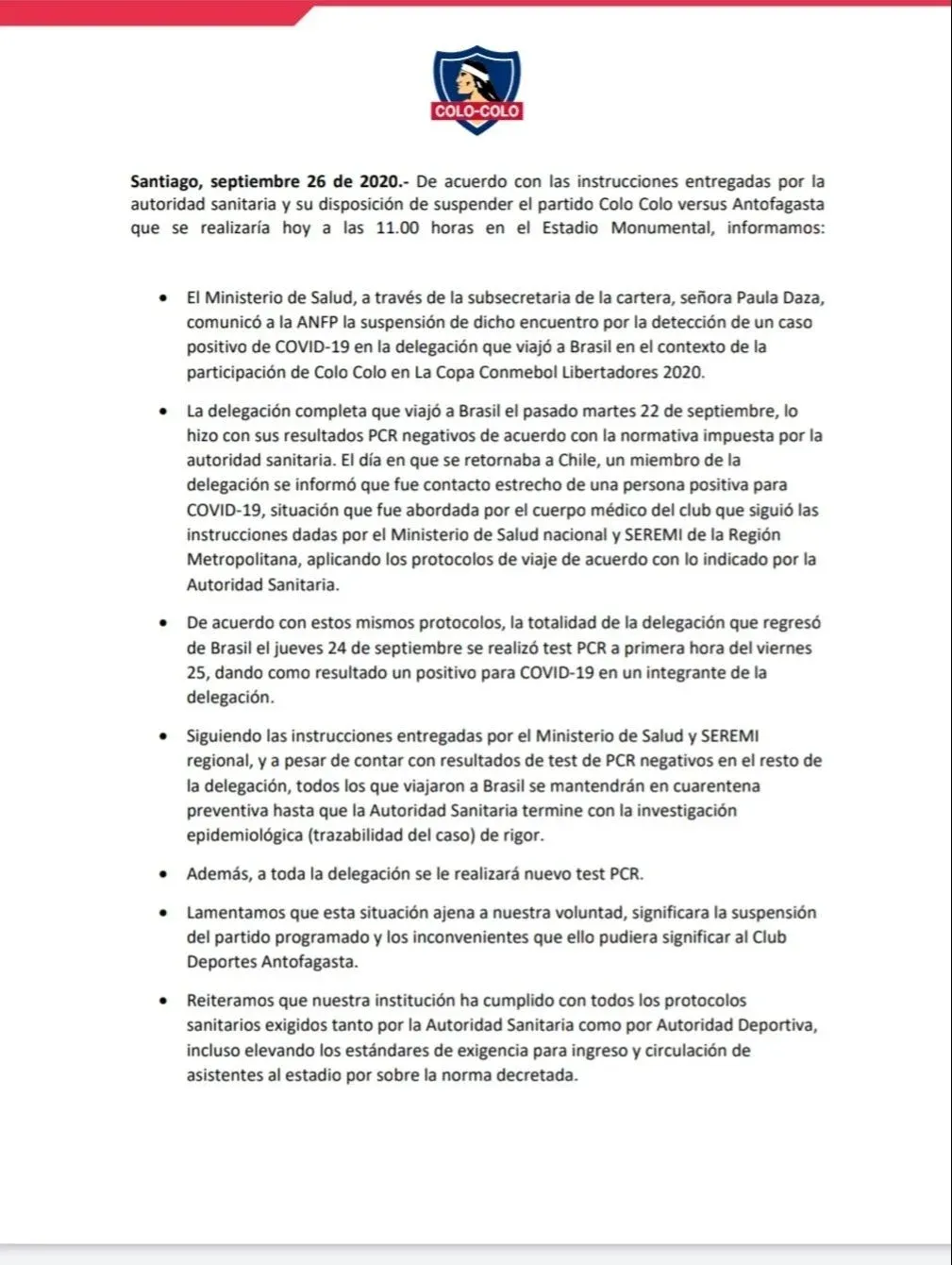 Colo Colo había viajado en esta semana a Brasil (el país con más casos y más muertos registrados por covid-19 en todo Latinoamérica) para enfrentar a Athletico Paranaense en Curitiba, con el que perdió 2-0.