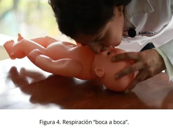 - Coloque su boca, sobre la boca y nariz del niño de tal manera que queden selladas (Figura 4). Realice una espiración para que el aire entre por la boca y nariz para llegue a los pulmones. La maniobra es efectiva si el pecho del bebé se eleva. (Figura 3).