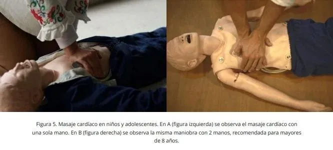 - Colocar el talón de la mano en el medio del pecho, justo por debajo de los pezones. En mayores de 8 años usar ambas manos entrelazadas. (Figura 5: A y B )