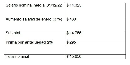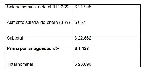 Al 31 de diciembre de 2022 la trabajadora percibía un salario nominal mensual por 40 horas semanales de $ 23.000 incluida la prima por antigüedad.