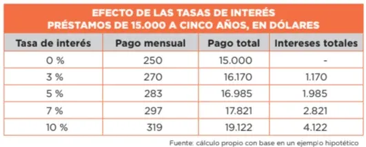 Si pides un préstamo de 15.000 dólares a una tasa de interés de 10%, para cuando canceles el préstamo habrás pagado 4.122 dólares en intereses. Dinero que podrías haber gastado en otra cosa. Nunca subestimes el impacto de las tasas de interés. Conocer el costo real antes de hacer una compra —más si se trata de una de esta magnitud— es clave.