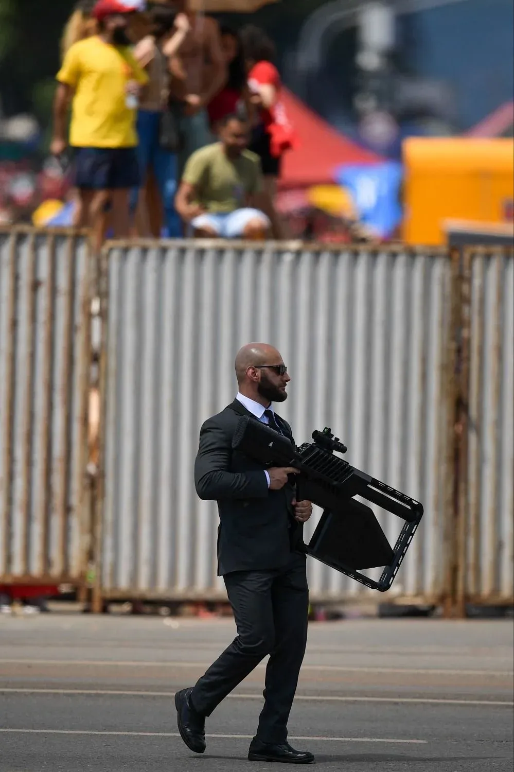 En realidad, se trata de una pistola antidrones dedicada a derribar esos artefactos voladores no tripulados, un dispositivo del que las fuerzas de seguridad deben cuidarse cada vez más en eventos como el ocurrido en Brasilia el primer día del año.