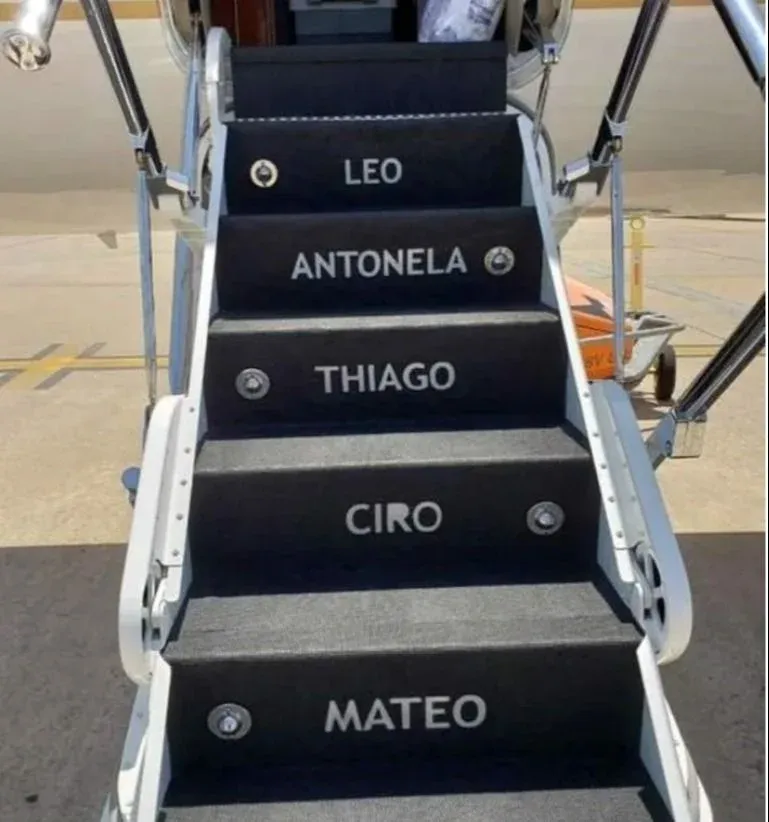 Por la escalerilla que bajaron Suárez junto a su familia este domingo, aparecen los nombres del crack argentino, de su esposa e hijos:. "Leo, Antonella, Thiago, Ciro y Mateo", dicen los escalones.