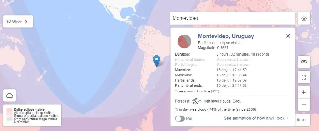 Para que todo lo anterior funcione hay que llegar con tiempo al lugar elegido (y seleccionarlo de antemano considerando ángulo y punto de vista). En este mapa interactivo se puede monitorear cómo será la trayectoria vista desde Uruguay. Según esta herramienta el eclipse se podrá ver durante tres horas y 32 minutos; la luna saldrá a las 17.44, el fenómeno alcanzará su punto máximo a las 18.30, terminará parcialmente a las 19.59 y definitivamente a las 21.17.