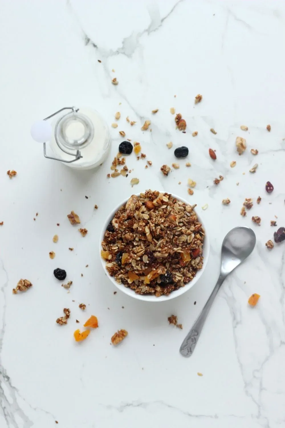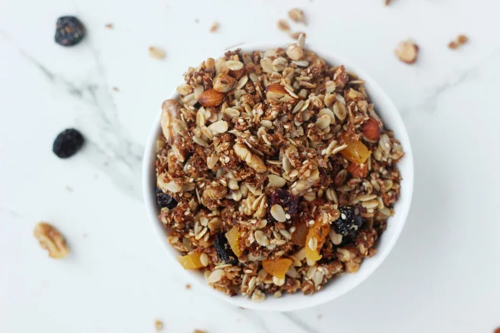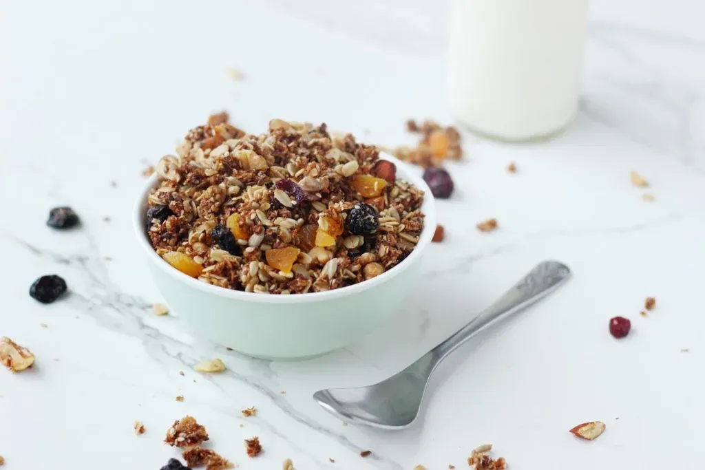 Lo que le falta a la granola es una proteína de origen animal, que podemos aportar sirviéndola con una porción de leche o yogurt. Si empezamos la mañana con una porción de proteína, a la tarde no tendremos esa locura por comer algo dulce que “el cuerpo nos pide”. Si no hay proteína suficiente en el desayuno o en el almuerzo, la tarde se hará super cuesta arriba desde el punto de vista energético. Estaremos desesperados buscando algo de azúcar o harina, y eso nos puede hacer engordar. Así que las mejores proteínas aliadas en el desayuno son el yogurt, leche, queso, huevo, ricotta, etc.. Con 150 ml de yogurt o dos fetas de queso basta para cumplir con la porción.