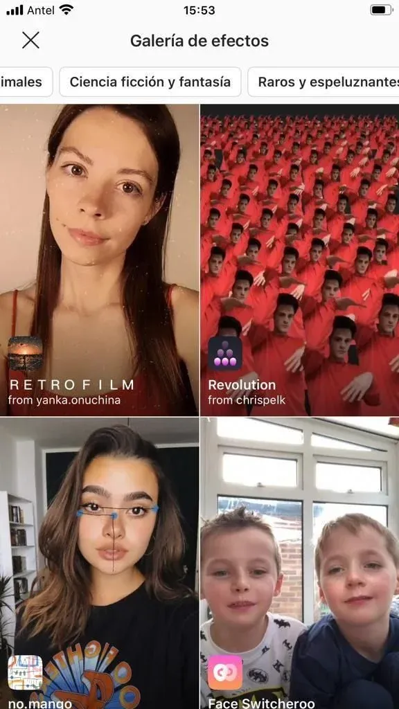 Solo debes acceder con tu usuario, entrar a la cámara e ir hasta la lupa que se encuentra en la parte inferior de la pantalla de tu teléfono para probar los efectos creados por la propia compañía y muchos de sus usuarios. Estos están clasificados en las siguientes categorías (que tu puedes seleccionar): Instagram, selfies, amor, calor y luz, estilos de cámara, estados de ánimo, divertidos, entorno, animales, ciencia ficción y fantasía, raros y espeluznantes, eventos, fandom y causas.