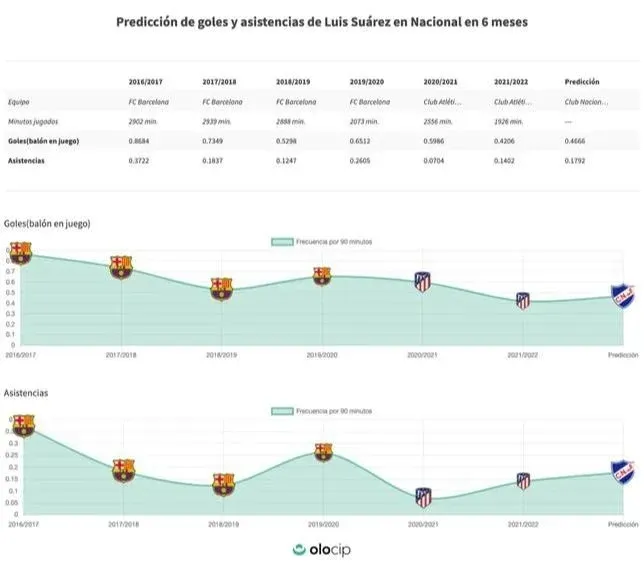 El informe destaca que el impacto que Suárez tendría en la construcción de juego de Nacional sería inmediato, con un gran rendimiento en ese rubro, superior a las estadísticas personales generadas en las últimas seis temporadas en el fútbol europeo.