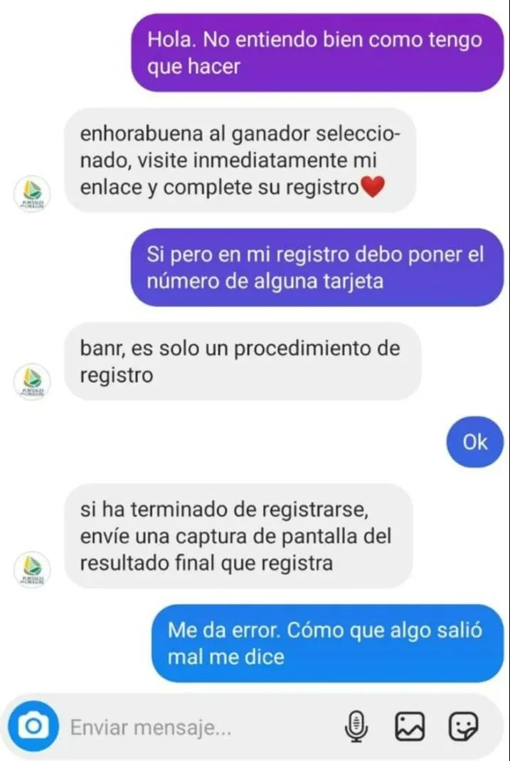 Con esa cuenta empiezan a seguir a muchos usuarios que decidieron participar del sorteo y arrobaron en sus comentarios a otras personas. Tras lograr seguirlos, les mandan un mensaje privado que entusiasma a cualquiera que anhela con ganar un sorteo.
