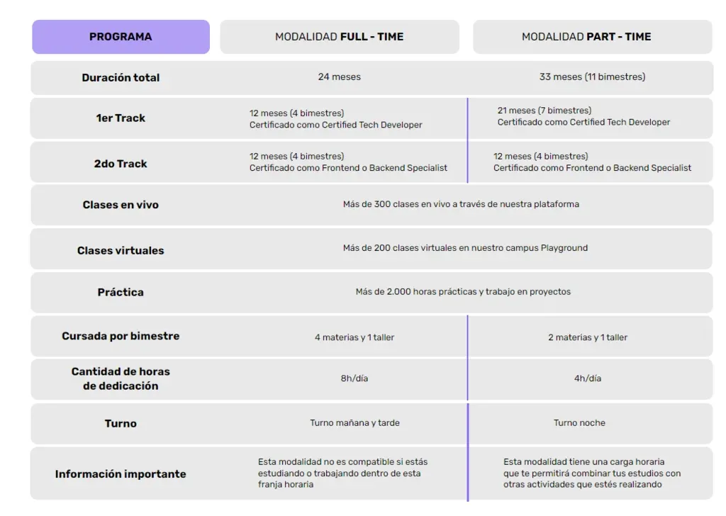 El curso tiene una modalidad full time, que permite cursarlo en 24 meses, ocho horas por día, o part time que es de 33 meses y permite combinar estudios u otras actividades que estés realizando.
