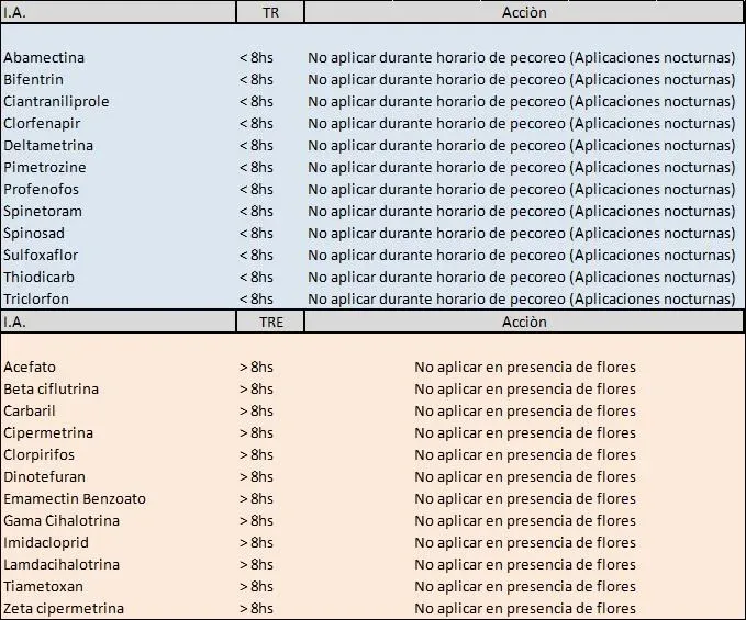 También se pide evitar la aplicación durante las horas de pecoreo de las abejas y siempre avisar a los apicultores que se encuentren cerca de los cultivos 48 horas antes de realizar la aplicación.