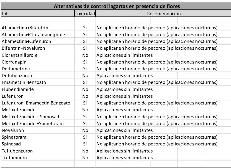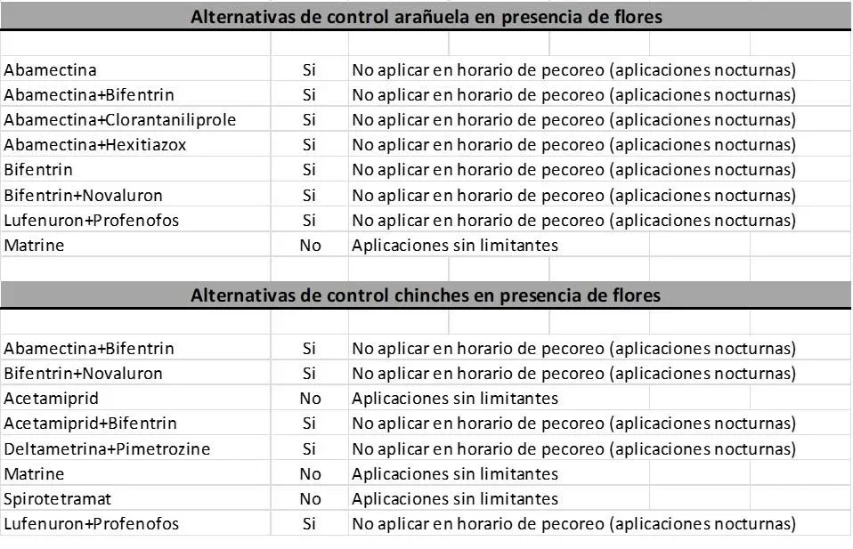Considerando las recomendaciones de la DGSA, el siguiente cuadro resume diferentes alternativas de productos que están autorizados para controlar plagas, así como los momentos de aplicación para proteger a los polinizadores.