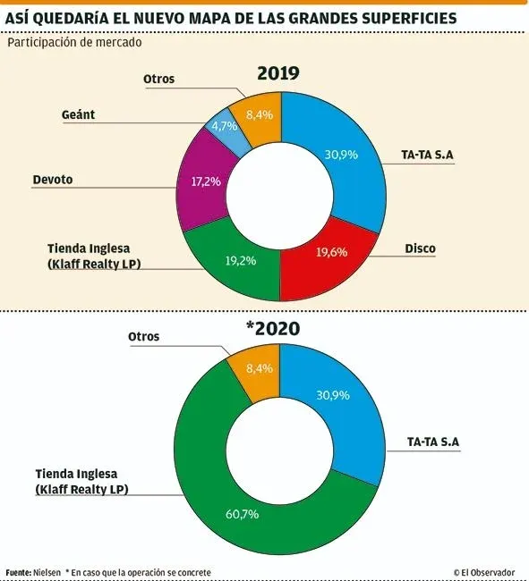 Si las negociaciones llegan a buen puerto y se confirma la venta del grupo Disco, el mercado quedaría reducido a dos grandes actores internacionales. Tienda Inglesa pasaría a tener el 60,7% de participación de mercado y con ello sería el principal jugador. Muy distanciado quedaría el grupo Ta-Ta del empresario argentino Francisco de Narváez, tomando como base los números de 2019. Estos porcentajes son considerando el total del país.