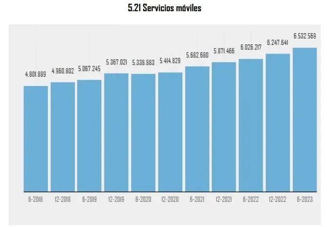 El Informe de Telecomunicaciones del organismo señala que entre enero y junio de este año hubo 6.532.569 servicios móviles contra 6.026.217 del mismo semestre del año pasado. Los datos mostraron un aumento de 8,4% en la comparación interanual y de 4,5% frente a la segunda mitad de 2022.