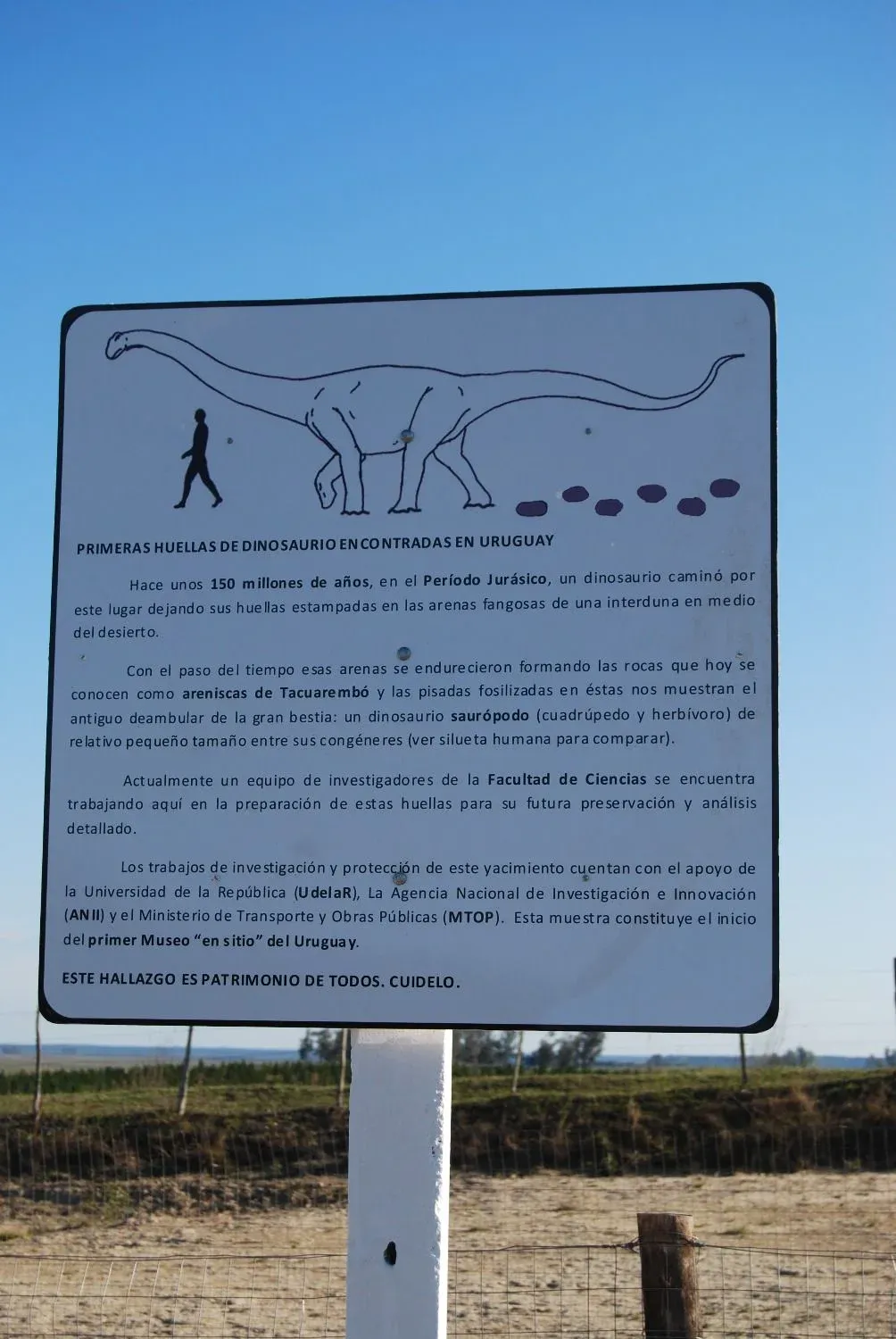 La Ruta de los Dinosaurios, como la llaman sus impulsores está en proceso de construcción desde 2009. Ese año, un grupo de paleontólogos encontró un yacimiento de pisadas fosilizadas sobre la ruta 26, en las inmediaciones del pueblo Cuchilla del Ombú, en Tacuarembó. Se trata de un dinosaurio saurópado y herbívoro, de tamaño “pequeño entre sus congéneres”, que habitó lo que hoy es Uruguay en el período Jurásico.